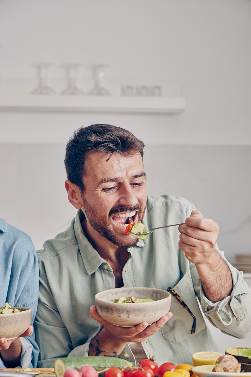 一个用刀叉吃早餐的男人