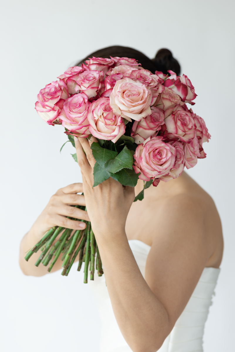 漂亮的深色皮肤的女人拿着一束玫瑰照片摄影图片